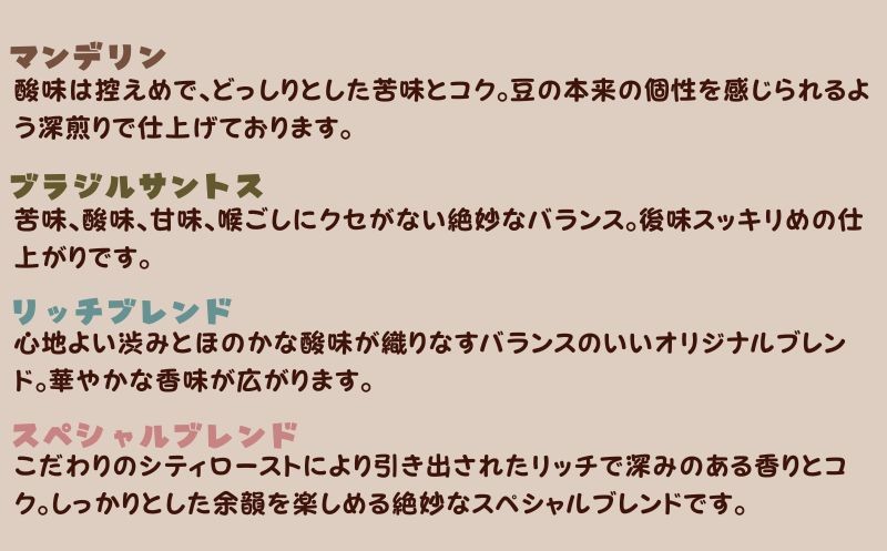 下記の中より、季節に合った種類とローストで2種類づつお届けいたします。