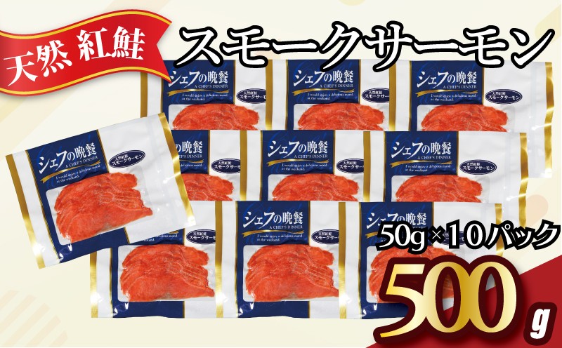 チョイスPayポイントと交換できる品 工場から直送!天然紅鮭を桜のチップで燻したスモークサーモン 鮭 サーモン 燻製 紅鮭 スモークサーモン 500g 50g×10パック 使い切り 食べきり カット スライス サーモン 鮭 さけ 燻製 無添加 スモーク 冷凍 真空 個包装 真空パック 切り身 切身 洋食 オードブル おつまみ おかず ストック 手軽 簡単 料理 冷凍食品 冷凍品 長期保存 お取り寄せ グルメ 魚 大容量 ギフト 贈り物 海の幸 ふるさと納税 ふるさと納税さけ 送料無料 千葉県 銚子市 松岡水産