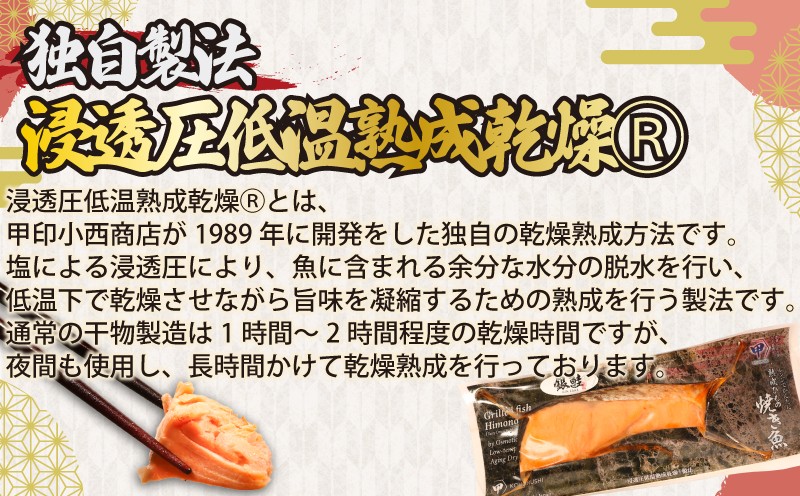 熟練の目利きにより選び抜かれた魚を、創業100年になる伝統と現在の技術によりたどり着いた独自の製法「浸透圧低温熟成乾燥」で旨みを凝縮させた一夜干しに仕上げました。満足頂ける特盛の詰め合わせです。また、保存料、合成着色料等は一切使用していない無添加商品です。 各魚ごとの真空パック個包装、未開封で冷凍保存できます。 要加熱調理(グリル、フライパンでお焼きください)。 【注意事項】 ・十分に加熱し、骨に注意してお召し上がり下さい。 ・写真はイメージです。 ・寄付者様都合での再送、返品は承れませんので、ご理解の上お選びください。 ・寄附者様のご都合(長期不在および住所・配送先変更等)により、謝礼品のお受取りできなかった場合や受取りまでに期間がかかった場合などは、再発送・転送はできませんので、予めご了承ください。 ※提供元:(株)甲印小西商店