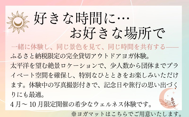 波音や心地よい潮風、どこまでも広がる空に包まれながら行うヨガは、日常を離れ、自分自身と静かに向き合う特別な時間をお届けします。