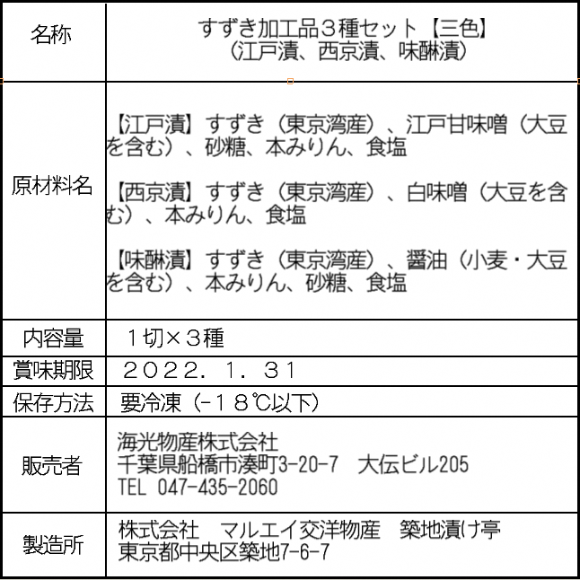 船橋で水揚げされた江戸前すずき(鱸)を三種類の漬魚に加工した冷凍品で、三種類の定番の漬魚を各1枚/計3枚入れたセットです。