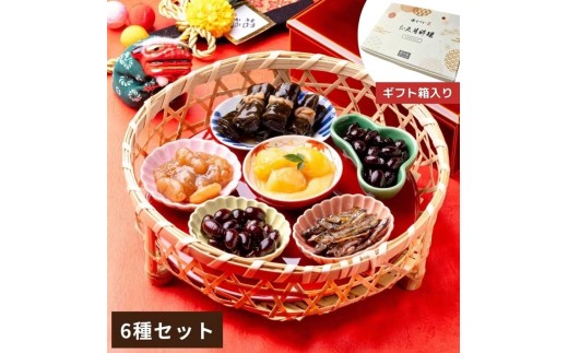 産地の違う2種の黒豆煮と、栗きんとん、昆布巻、大福豆豆きんとん、田づくりの全6種入りです。いずれの品も国産の食材を使用し、無添加調理をいかした、食材本来のおいしさを追求しています。