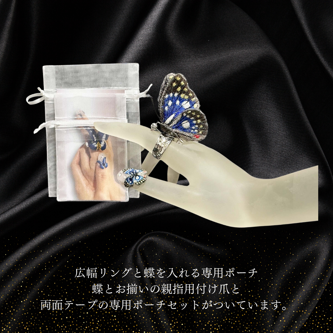国蝶のオオムラサキ蝶は、刺繍糸よりも細い糸一本取りで表を刺すだけで裏も同じになるという独自の両面刺繍技法で羽を刺し、その上にカラー金糸、ラメ糸を添えるように刺して羽の薄さや蝶特有の輝きを再現し、蝶自体がブローチになっており、羽が開いたり閉じたりと本物の蝶と同じ動き形状ができる蝶のアートジュエリーです。