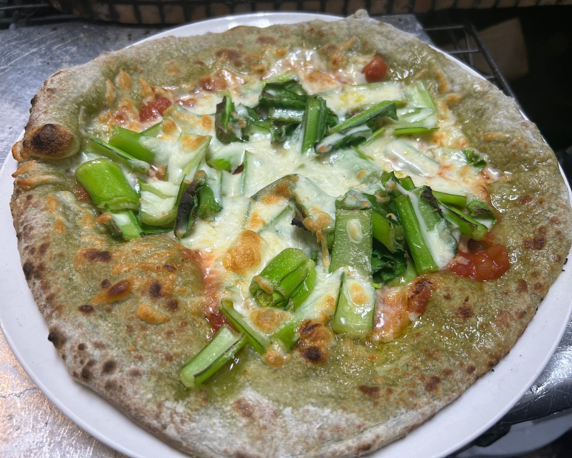 船橋産の小松菜パウダーを練りこんだ当店オリジナルの緑色をしたピザ生地は2日間冷蔵庫にて発酵させたもちもちの生地です。