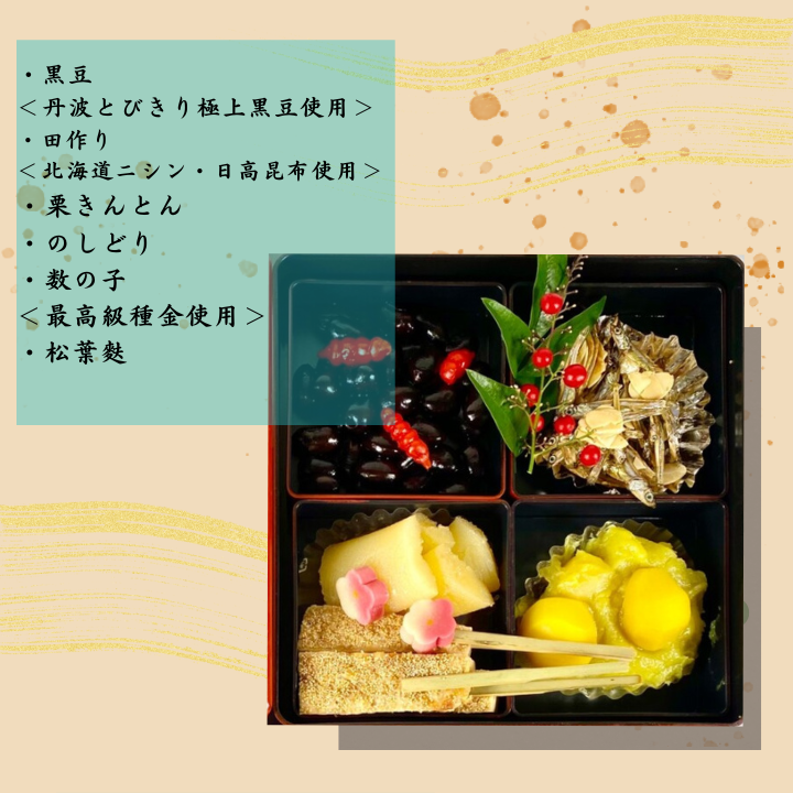 ・黒豆:黒豆、砂糖、醤油、重曹、塩、三温糖