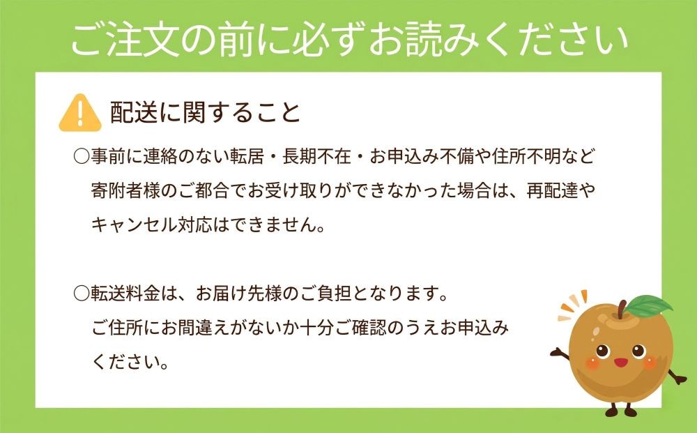 ●長期不在のご予定や配送曜日希望等があれば要望欄にご記入ください。尚、長期不在等によりお礼の品をお受取りできなかった場合、再発送やキャンセルはいたしかねますのでご了承ください。