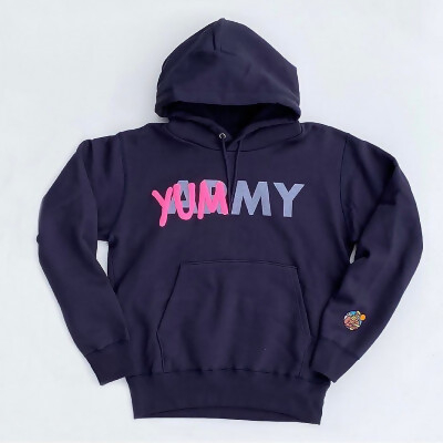 ミリタリーものではお馴染みの「ARMY」ロゴをちょっとひねって「YUMMY(うまい!)」に変えた館山スープカレーアパレルのスウェットパーカー。私たちPLUSHのデザインと館山では数少ないアパレル関係の皆さんの技術がギュッと詰まった一着です。