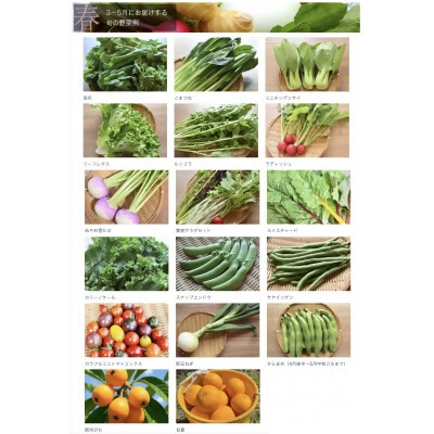 菜花・小松菜・ミニチンゲンサイ・リーフレタス・ルッコラ・ラディッシュ・あやめ雪かぶ・葉物サラダセット・スイスチャード・カリーノケール・スナップエンドウ・さやいんげん・カラフルミニトマト・新玉ねぎ・そらまめ(4月後半~5月中旬ごろまで)