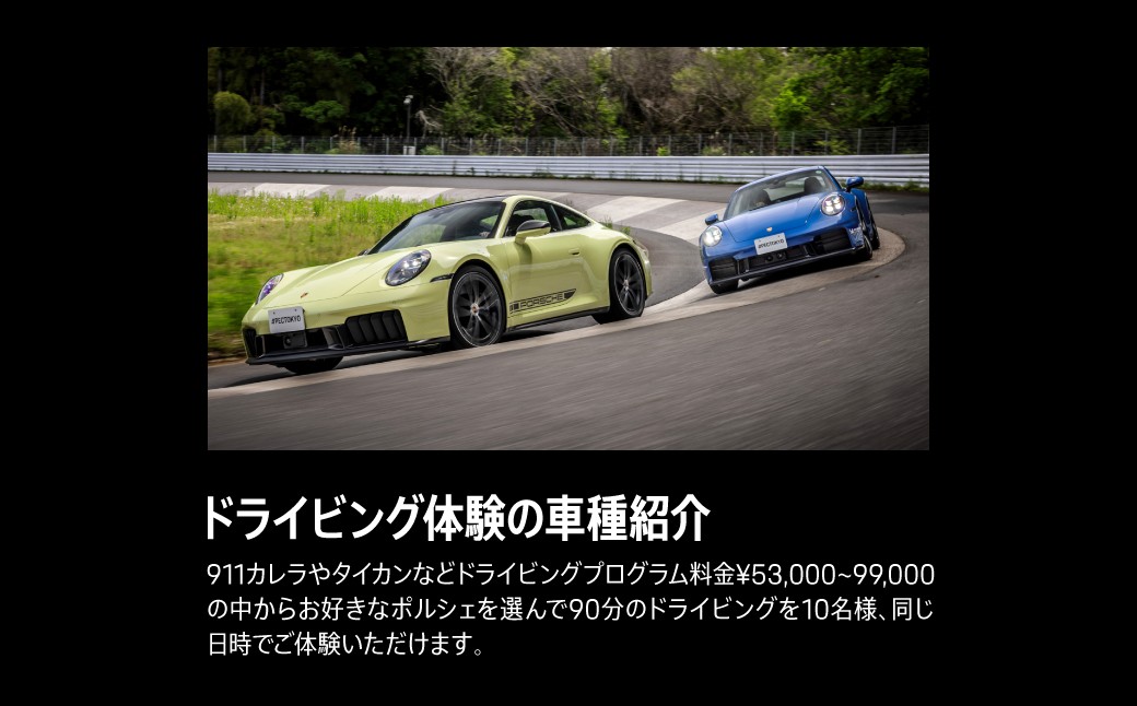◆90分のドライビングプログラム:記載の車種の中からお好きなポルシェを選んでお楽しみいただけます。