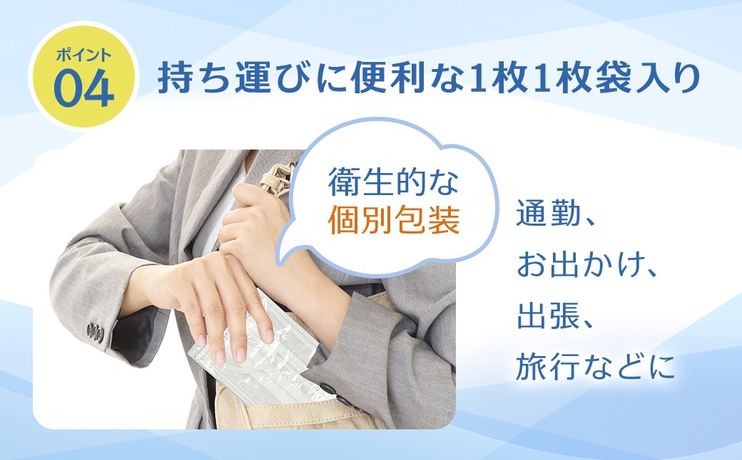 持ち運びに便利な1枚1枚袋入りで、JIS T9001 一般用マスク適合番号を取得した商品です。