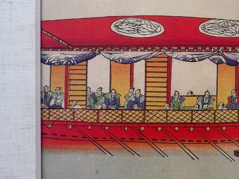 小金原での御鹿狩に向かう将軍一行が、金町松戸間に架けられた船橋を渡る様子が描かれています。