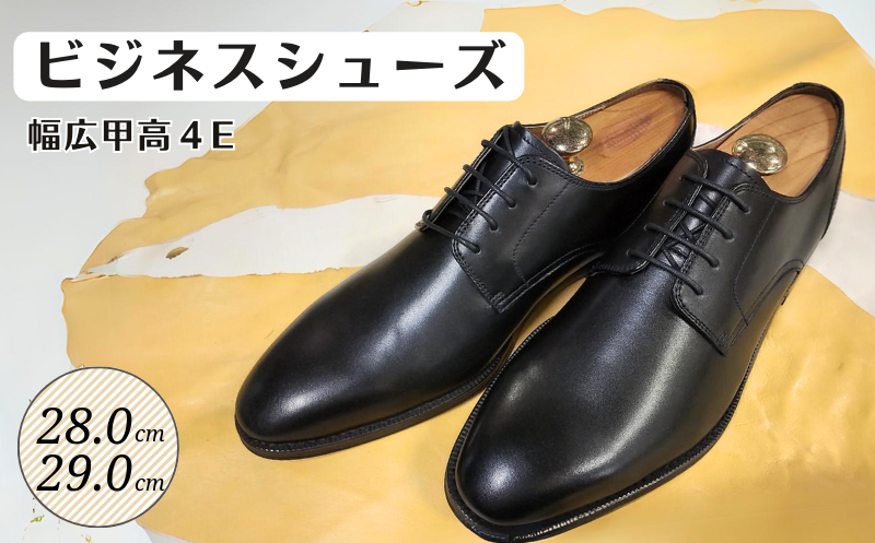 日本人に合うよう幅広、甲高の木型を採用した4Eのプレーントゥのビジネスシューズ。