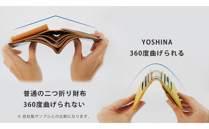 また、YOSHINAは牛革と豚革を貼り合わせるこだわり製法により360°折り返せるので、すべて取りやすい方向からカードを取り出せます。
