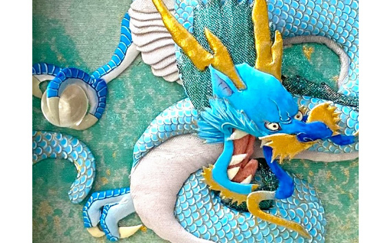 制作の特徴としては、日本の伝統工芸の押絵(綿を入れ着物で包んだもの)で作品を構成しています。金襴地や正絹をふんだんに使い、豪華な〈水龍〉に仕上げました。