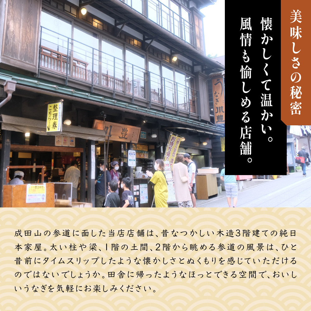 【配送不可:沖縄・離島】 「うなぎの街」として名高い千葉県成田市のうなぎ料理店の中でも、常に行列の絶えない老舗・川豊のうなぎ蒲焼です。 成田市の元祖うなぎ専門店・川豊では、新鮮な状態でのうなぎの調理にこだわり、井戸水で活かした新鮮なうなぎを「割きたて、蒸したて、焼きたて」で提供しています。 新鮮な状態で調理されたうなぎならではの“ふっくらとした食感”と創業以来継ぎ足し続ける“秘伝のたれ”に老舗の格を感じる一品です。 ※画像はイメージです。 ※沖縄・離島はお届け不可となります。 ※上記のエリアからの申し込みは返礼品の手配が出来ないため、「キャンセル」または「寄附のみ」とさせていただきます。予めご了承ください。 ※ご入金後、約3週間程度でお送りしております。(年末年始を除く) ※12月中旬以降の寄附につきましては1月中旬頃から2月いっぱいにかけて順次発送予定となります。 ※お届け日の指定は承っておりません。 ※一度に複数口のお申し込みをいただいた場合、お届け日が別々になってしまう事がありますので、ご了承ください。 ※賞味期限は製造から1週間となります。予めご了承ください。