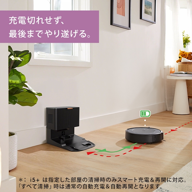 掃除中に充電残量が少なくなると、自動でホームベースに戻り充電。その後、中断したところから清掃を再開します。*i5+は指定した部屋の清掃時のみスマート充電&再開に対応。「すべて清掃」時は通常の自動充電&自動再開となります。