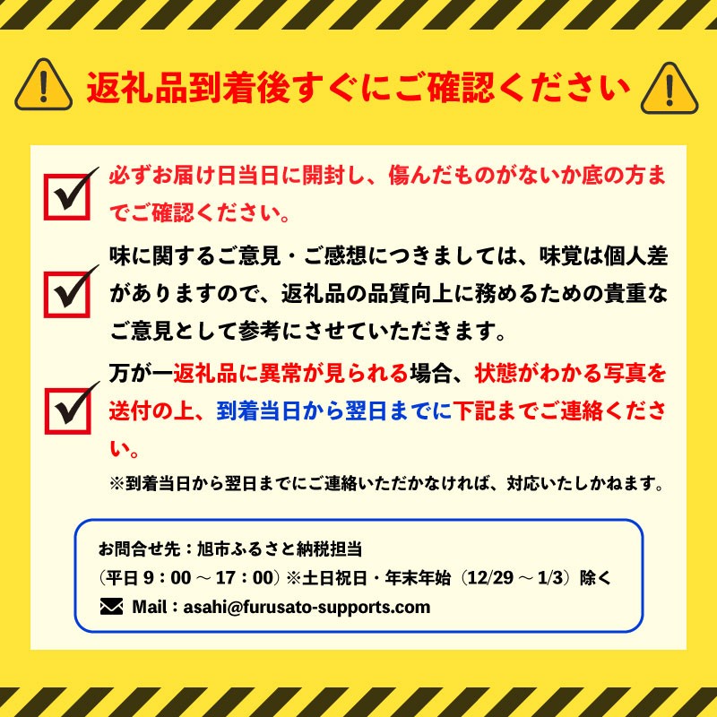 ■返礼品に異常が見られる場合、画像添付の上、到着当日から翌日までにご連絡ください。