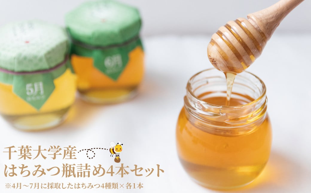千葉大学の柏の葉キャンパスで学生・教職員が製造したはちみつボトル(4月~7月の4種類)です。千葉大学ではミツバチに関係する研究を行っており、その副産物としてはちみつが得られます。