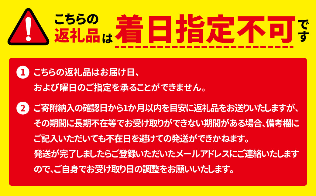 ご寄附納入の確認日から1か月以内を目安に返礼品をお送りいたします。 ※お届け日のご指定はお受けできません。ご了承ください。 |