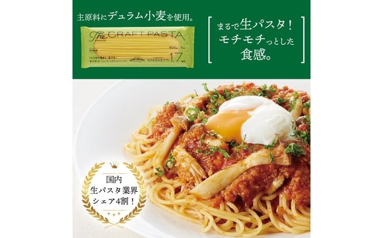ニューオークボの「ザ・クラフトパスタ シリーズ」は、名前の通り、ブロンズダイスで押し出して製麺することで表面がザラザラになり、ソースの絡みが良いパスタです。