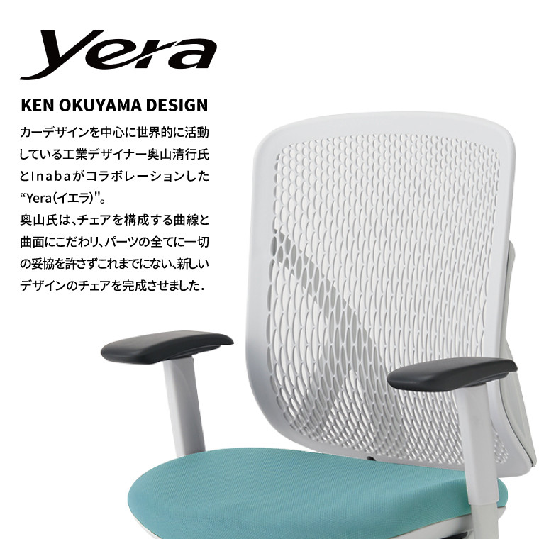 Yera(イエラ)は工業デザイナー、奥山清行氏プロデュース。KEN OKUYAMA DESIGN が人間工学に基づきデザインされました。背の樹脂メッシュは背中を優しく包み込み、座面は座圧を分散し大腿部の圧迫を軽減する設計で、長時間座っても疲れにくい、理想的な座り心地を実現する人間工学に基づいたデザインチェアです。