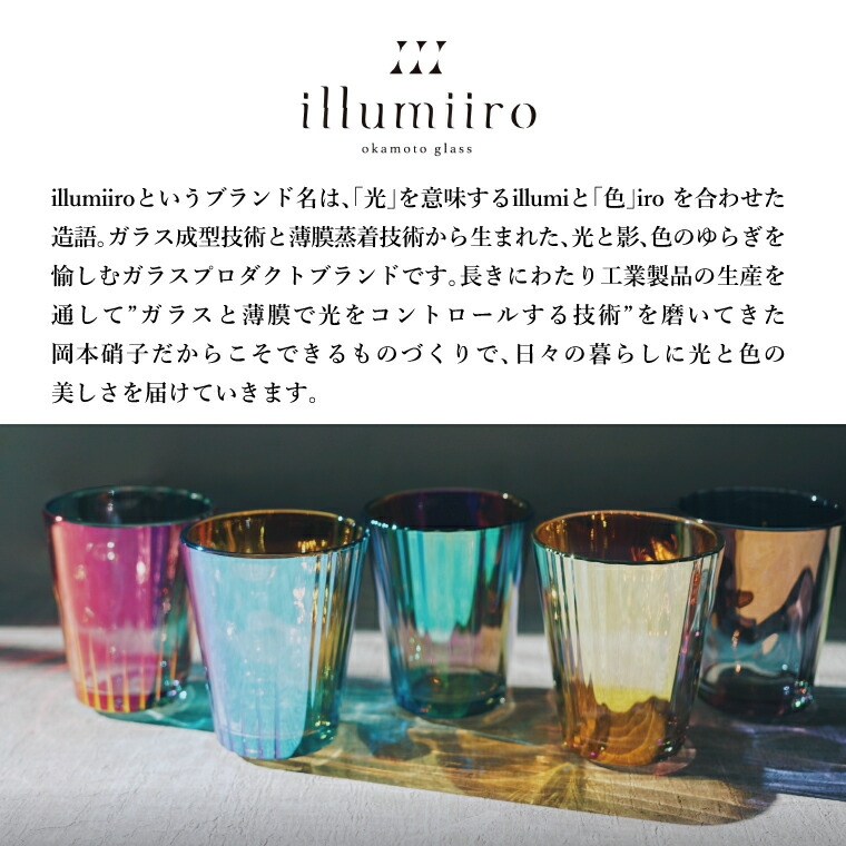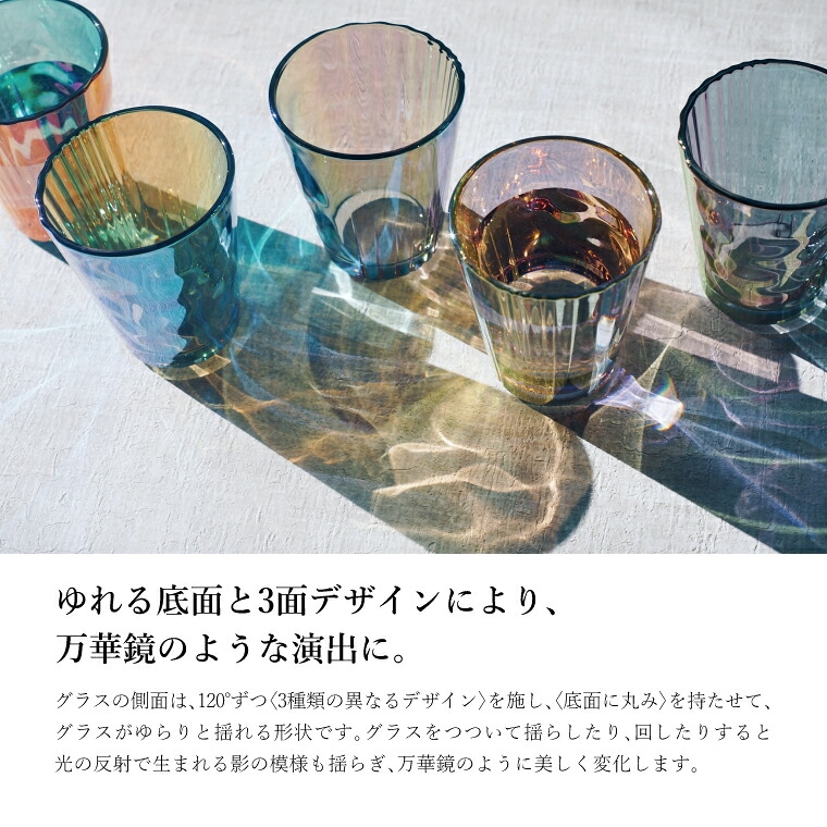「揺れるグラス」には、岡本硝子が創業以来受け継いできた「成型」と「蒸着」の高い技術が詰め込まれた他のどこにもない唯一無二のグラスです。〈側面の3面デザイン〉と〈底の丸み〉という複雑な形状を高度な職人技によって成型し、そこへ蒸着技術による光の干渉を利用した絶妙な色合いを施すことで、その瞬間にしか出会えない輝きをお楽しみいただけます。