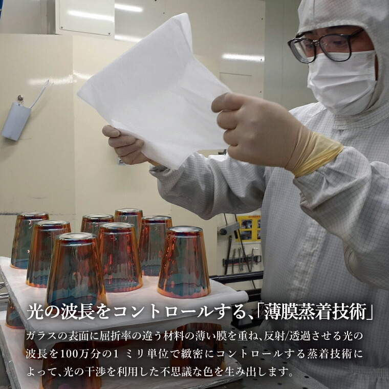 ガラスの表面に屈折率の異なる薄い膜をコーティングすることによって光の干渉を利用した不思議な色を生み出します。