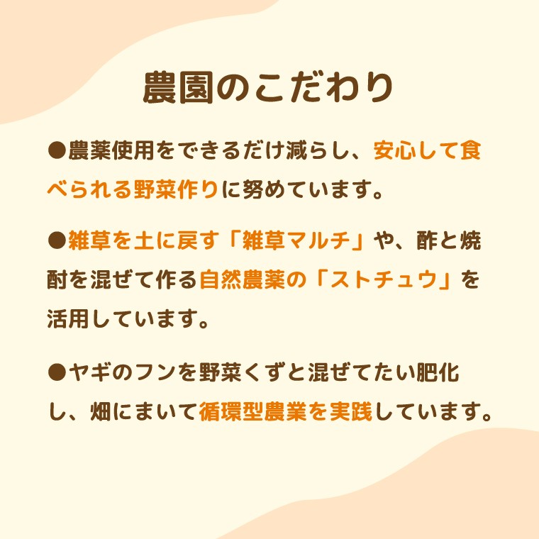 栽培している農産物は、雑草を土に戻す「雑草マルチ」や、酢と焼酎を混ぜて作る自然農薬の「ストチュウ」を活用し、ヤギのフンを野菜くずと混ぜてたい肥化し、畑にまいて循環型農業を実践。
