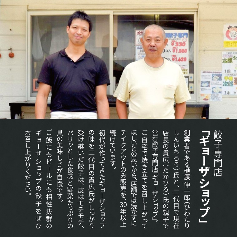 餃子専門店「ギョーザショップ」は、創業者である樋渡 伸一郎(ひわたり しんいちろう)氏と、二代目で現在店長の貴広(たかひろ)氏の親子で営んでいます。