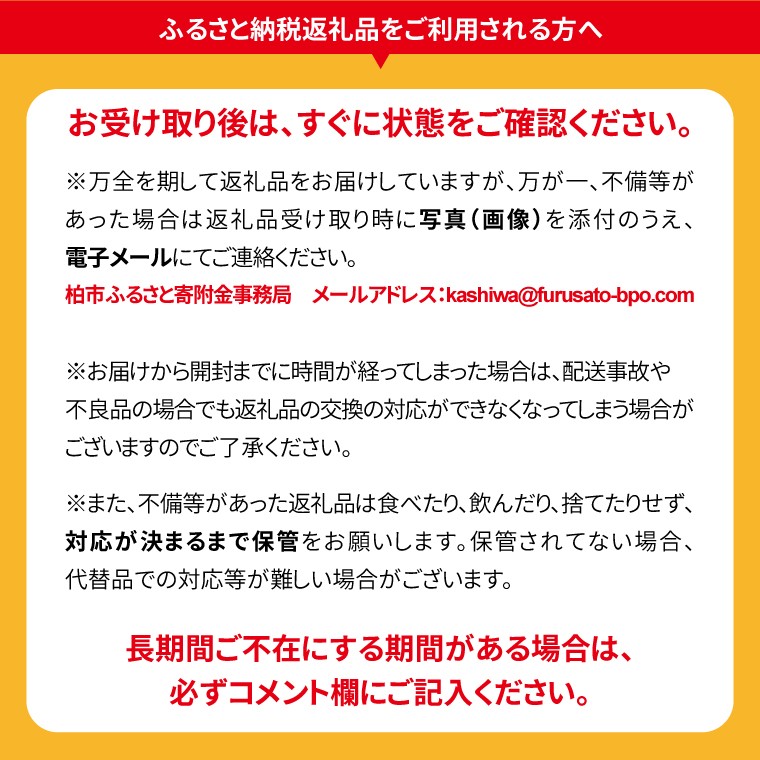 返礼品をお受け取りいただいたあとは、なるべく早めの開封をお願いいたします。お届けから開封までに時間が経ってしまった場合、配送事故や不良品であった場合でも、返礼品の交換の対応ができなくなってしまう場合がございますのでご了承ください。