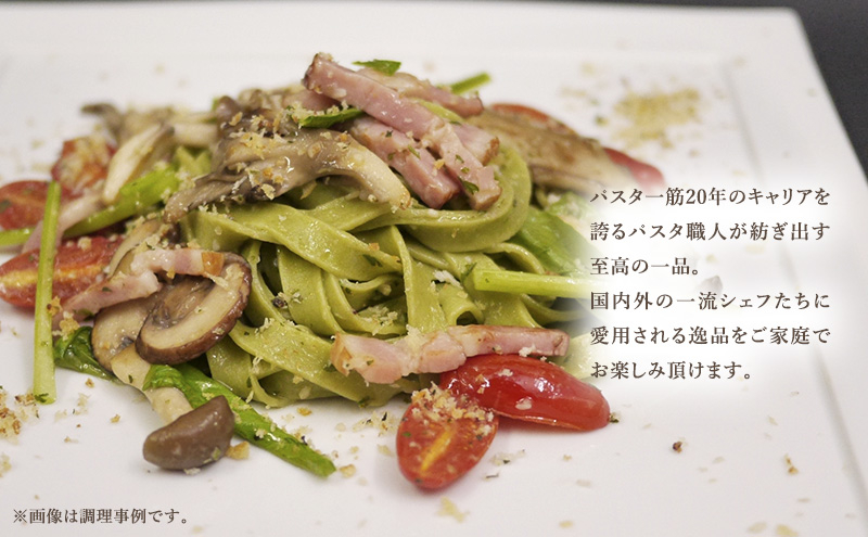 パスタ一筋20年のキャリアを誇るパスタ職人が紡ぎ出す至高の一品。厳選された小麦粉と新鮮な卵の風味にルッコラの風味と色味を加えた麺。もちもちした食感に加え、舌の上でしっかりとした歯ごたえを感じつつ、心地よい歯切れが織りなす絶妙なハーモニーが、ソースの旨みを引き立てます。高級レストランで作られる生パスタと同様に、生地を折り返しながら薄く延ばすローラー式製麺法で、本格的な生パスタの味を表現しています。国内外の一流シェフたちに愛用される逸品をご家庭でお楽しみ頂けます。