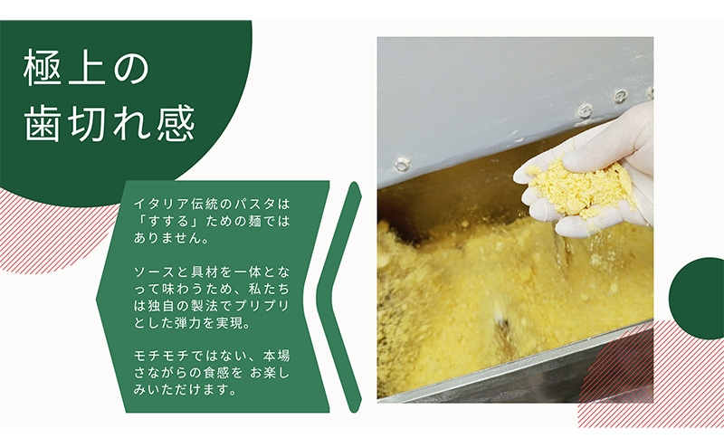 歯切れと歯ごたえのバランスが絶妙な、プロの料理人も認める本格派の生パスタ。ソースとの絡みも抜群で、一口ごとに上質な食感をお届けします。