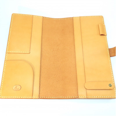 厚めの牛ヌメ革(外側2.2mm/内側1.2mm)を使用し、縫製は丈夫な糸を使いしっかり手縫いで仕上げ、ヘリの部分も丁寧に磨いてあります。