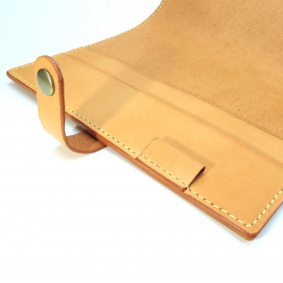 厚めの牛ヌメ革(外側2.2mm/内側1.2mm)を使用し、縫製は丈夫な糸を使いしっかり手縫いで仕上げ、ヘリの部分も丁寧に磨いてあります。