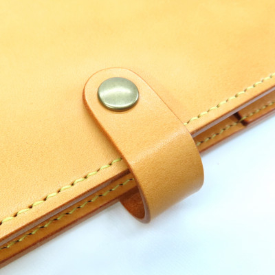 厚めの牛ヌメ革(外側2.2mm/内側1.2mm)を使用し、縫製は丈夫な糸を使いしっかり手縫いで仕上げ、ヘリの部分も丁寧に磨いてあります。