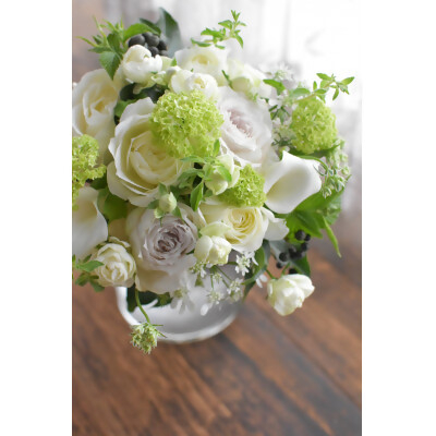 たくさんのグリーンを使用し、自然の草花をイメージした、心和むアレンジメントをお楽しみください。