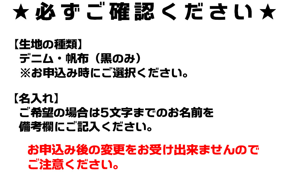 素材にデニム、または帆布を使用しているため非常に丈夫で、使い込むほどに生地の感触や色合いも馴染んでくるため、長くご使用いただき、変化も見守りながら自分だけのに育てる楽しみもある一品です。