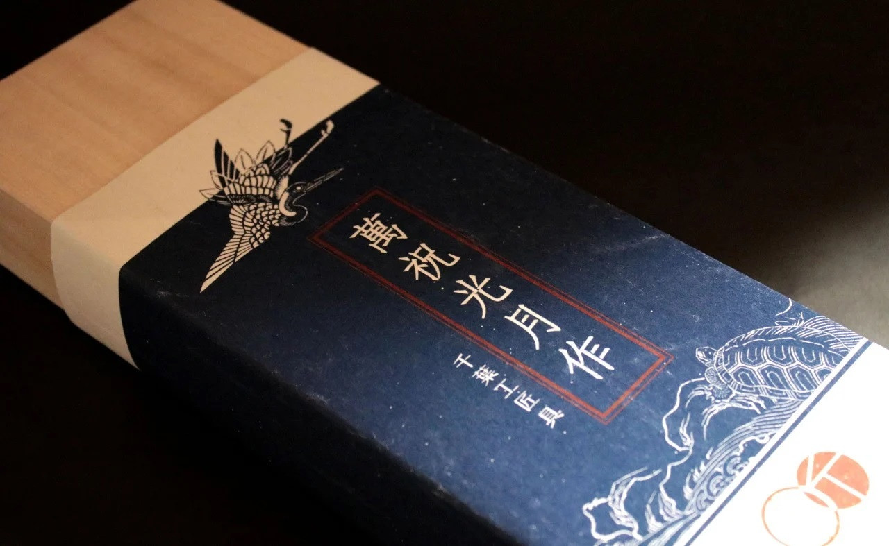 前掛けとお箸は萬祝をモチーフにした縁起の良いお品です。和牛刀には高級な紫檀柄を使いました。