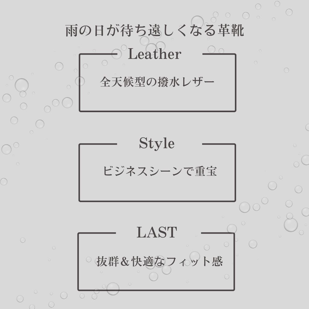 水に強い高機能の撥水レザーと、何万人のお客様の足を見てきた経験と日本人の足の統計から導き出したこだわりのラスト(木型)によるフィット感が特徴の“究極の全天候型シューズ”です。
