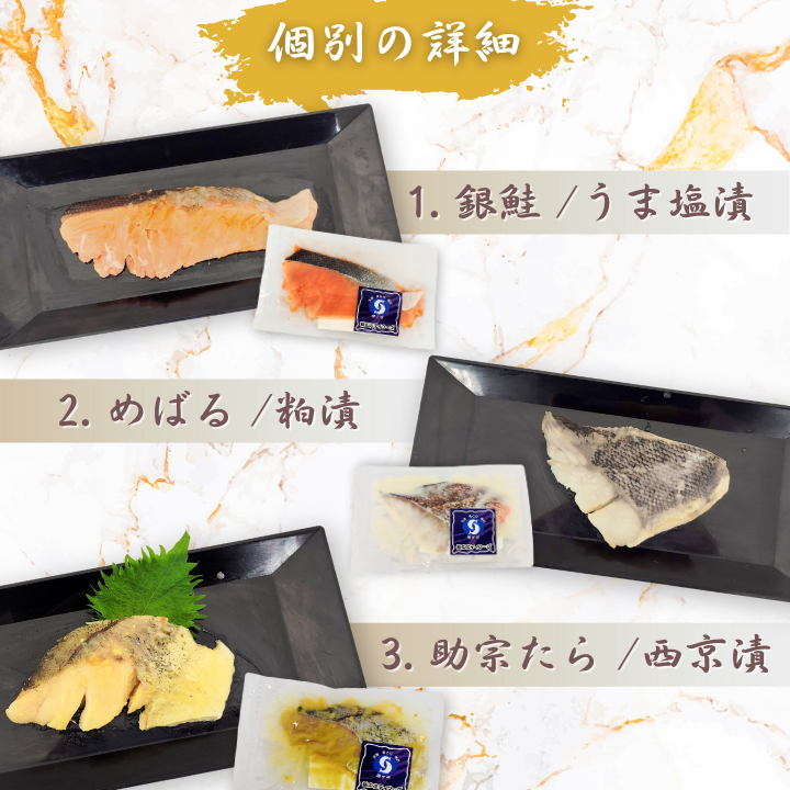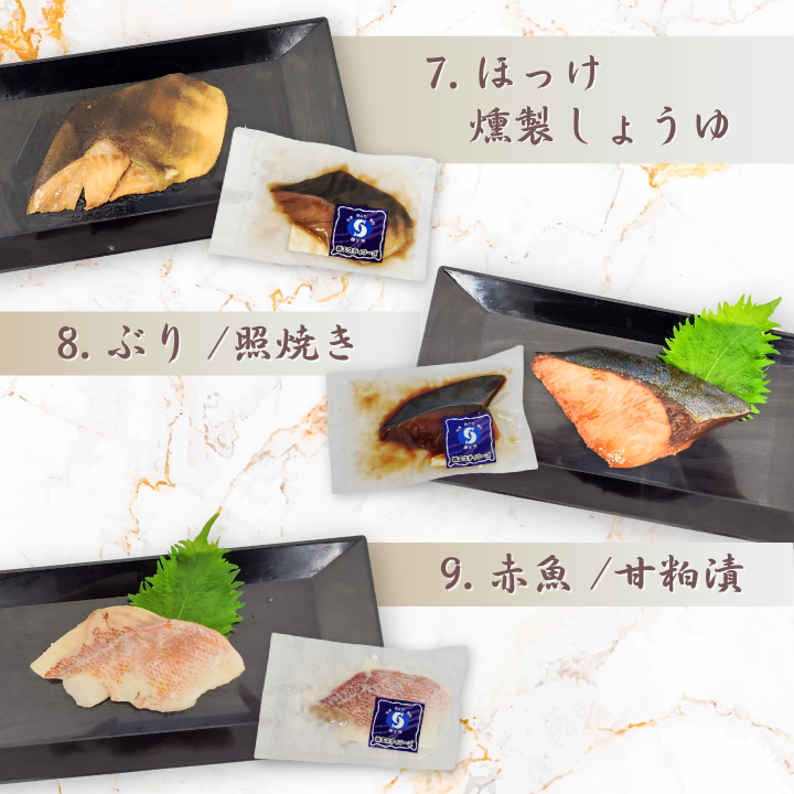 以下のお魚と味付けの一覧から、厳選した品をお届けします。