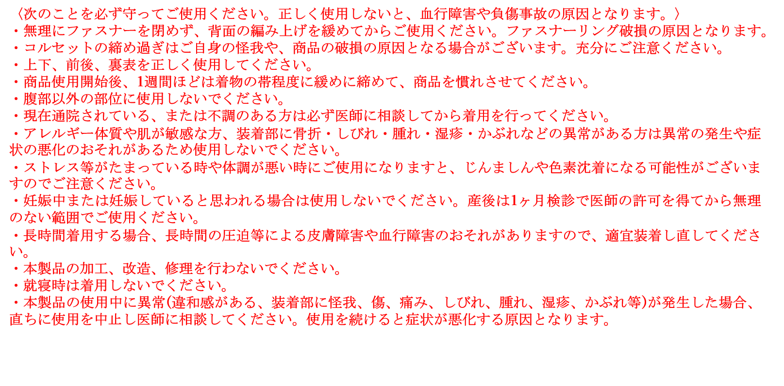 ・コルセットの締め過ぎはご自身の怪我や、商品の破損の原因となる場合がございます。充分にご注意ください。