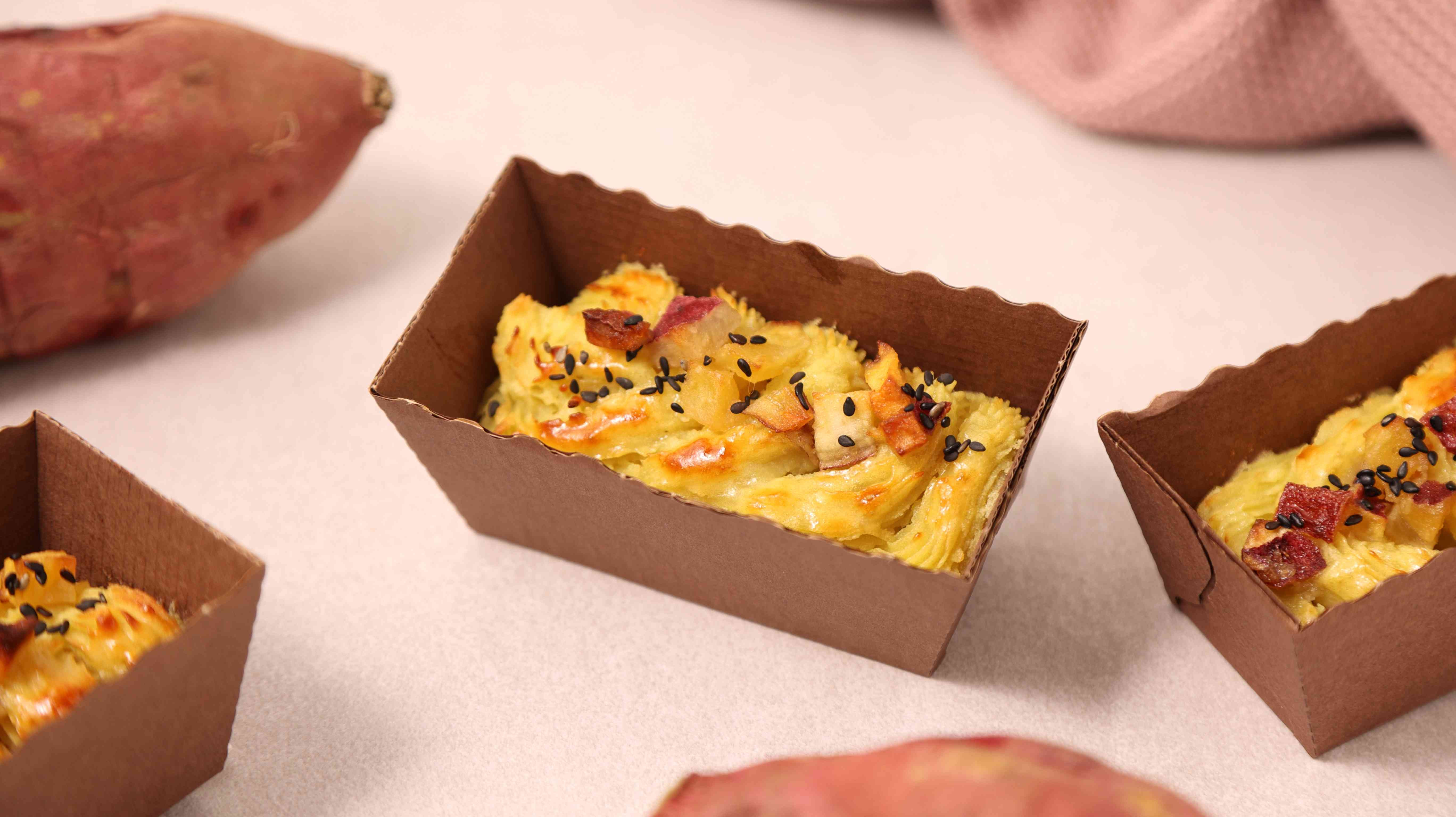 濃厚でクリーミーなさつまいも生地をしっとりと焼き上げ、蜜で仕上げた角切りのサツマイモをトッピングしました。