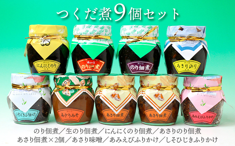 つくだ煮 9個 おすすめ 海苔 のり 生のり あさり 味噌 佃煮 あみえび ふりかけ しそ ひじき 無添加 自家製 手作り 詰め合わせ セット ごはんのお供 のっけ飯 ご飯 おかず ギフト 贈り物 贈答用 プレゼント お中元 お歳暮 化粧箱 のし 熨斗 お中元 お歳暮 自宅用 手土産 詰合せ 手づくり 瓶詰 マルヨーのり製造所