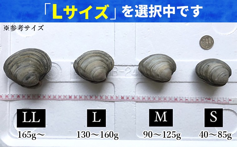 | 容量 | 総重量:1.5kg 砂抜き処理済み サイズ:L(130~160g) |