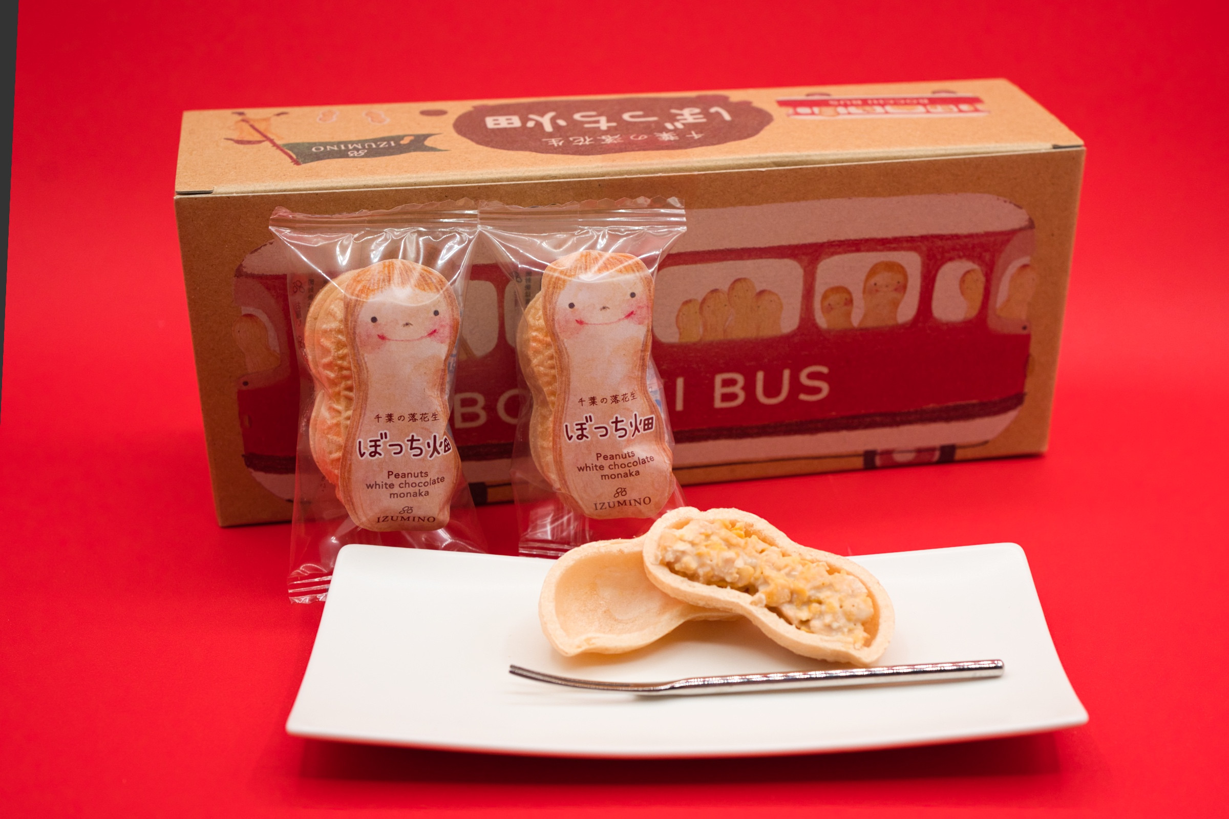 バスの絵が描かれた箱「BOCCHI BUS」に、落花生チョコ最中(ぼっち畑)が8個入っています。