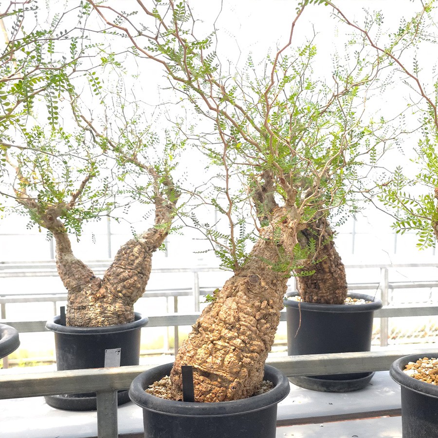 ウルシ科オペルクリカリア属(Anacardiaceae Operculicarya)に属し、複雑に隆起したコルク状の幹からジグザグに枝を伸ばし、小さな丸い葉を茂らせます。幹の表皮はデコボコしてシルバーの色味を帯びており、独特な風貌と存在感が魅力です。