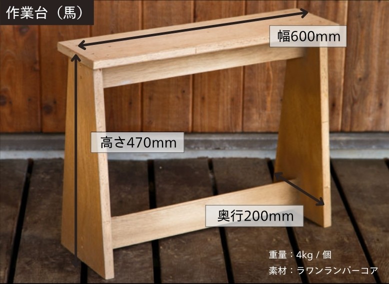 | 容量 | 作業台(馬) 2点 サイズ 幅:600mm 高さ470mm 奥行:200mm 重量 4kg 素材 ラワンランバーコア |