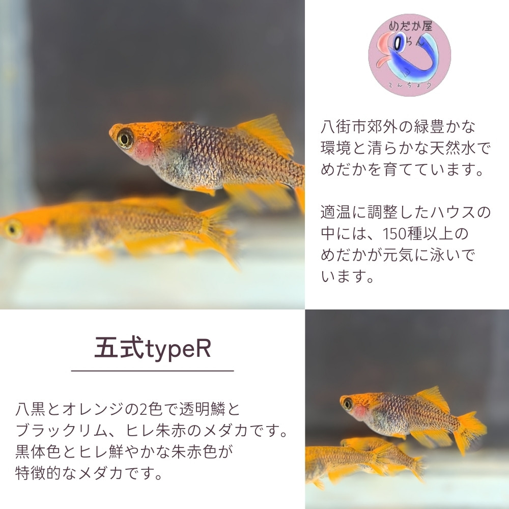 五式typeR…黒とオレンジの2色で透明鱗とブラックリム、ヒレ朱赤のメダカです。黒体色とヒレ鮮やかな朱赤色が特徴的なメダカです。