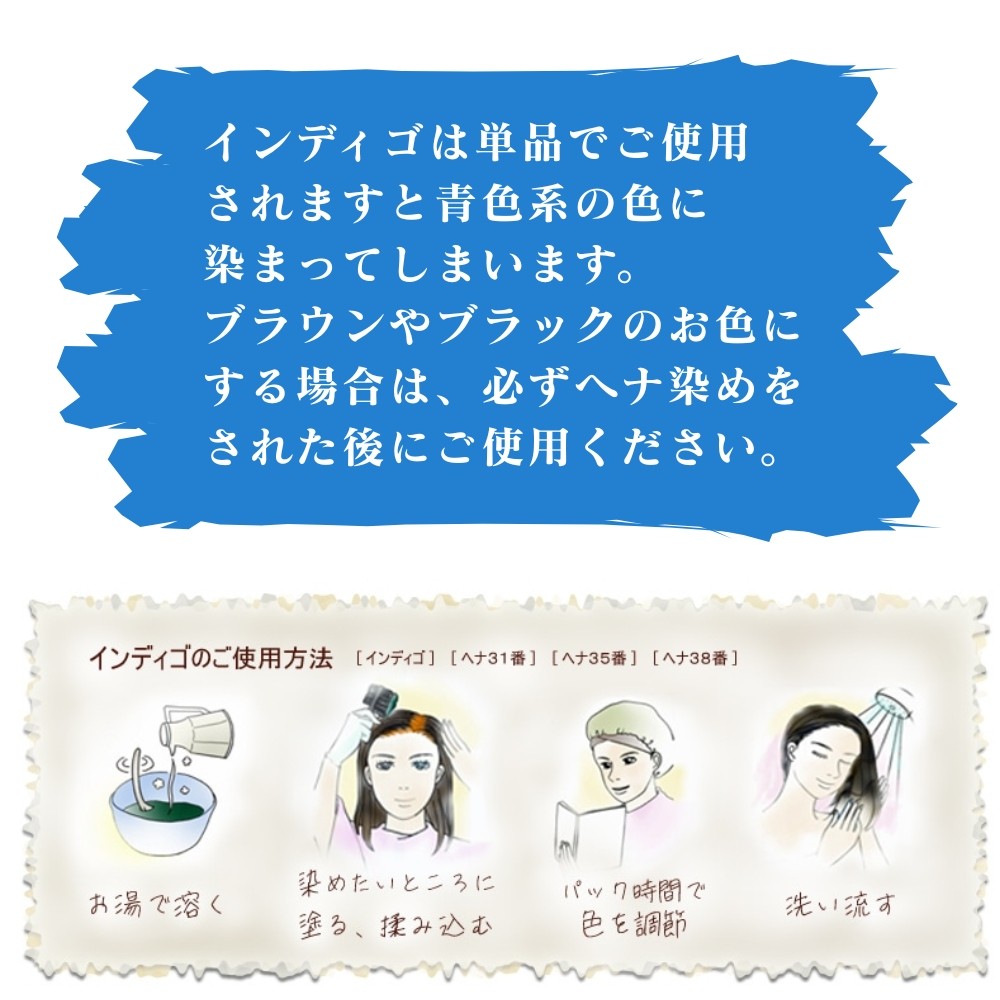 ※インディゴを単体で使用しても白髪を黒く染めることはできません。(藍色になってしまいます)