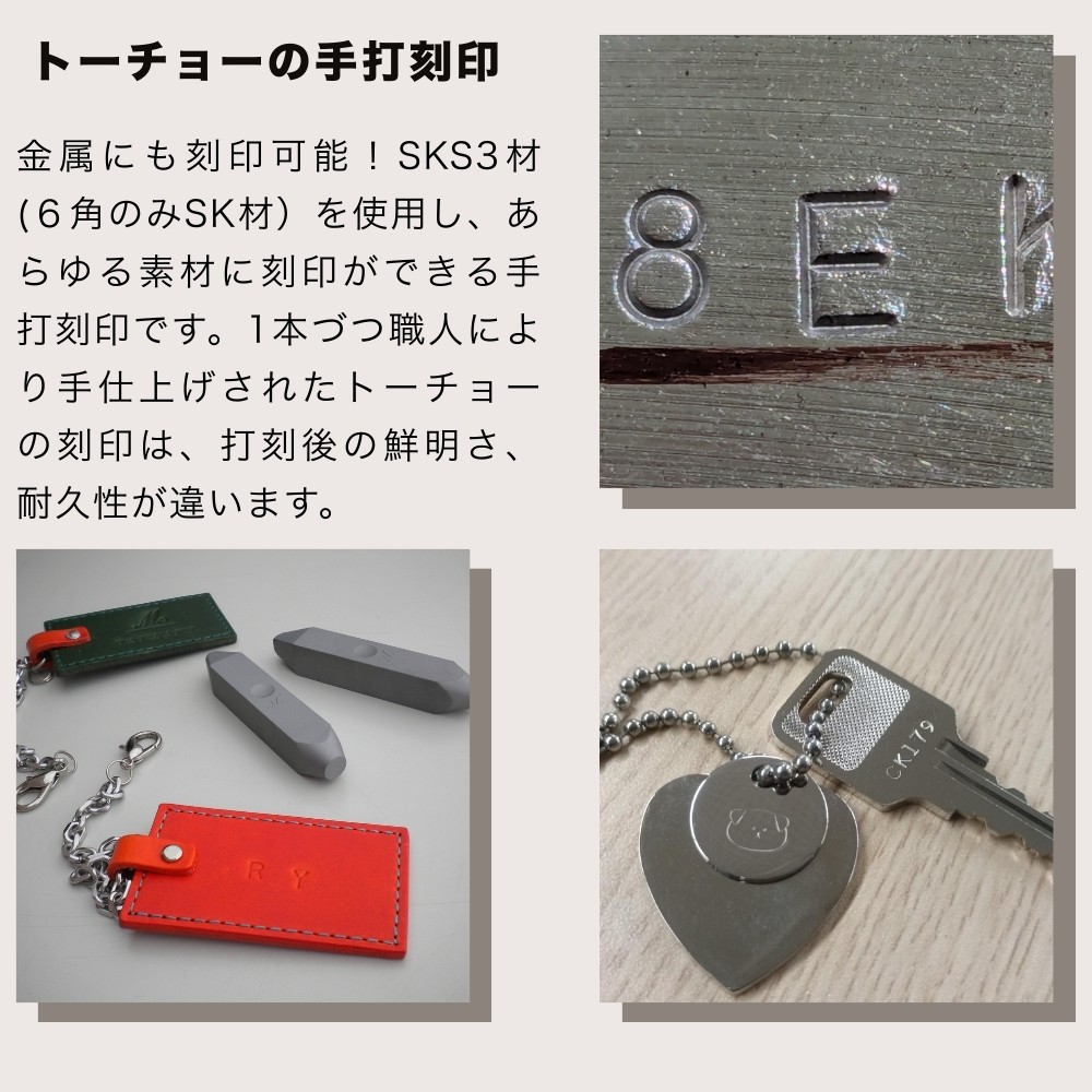 金属にも刻印可能!SK材を使用し、あらゆる素材に刻印ができる手打刻印です。1本づつ職人により手仕上げされたトーチョーの刻印は、打刻後の鮮明さ、耐久性が違います。